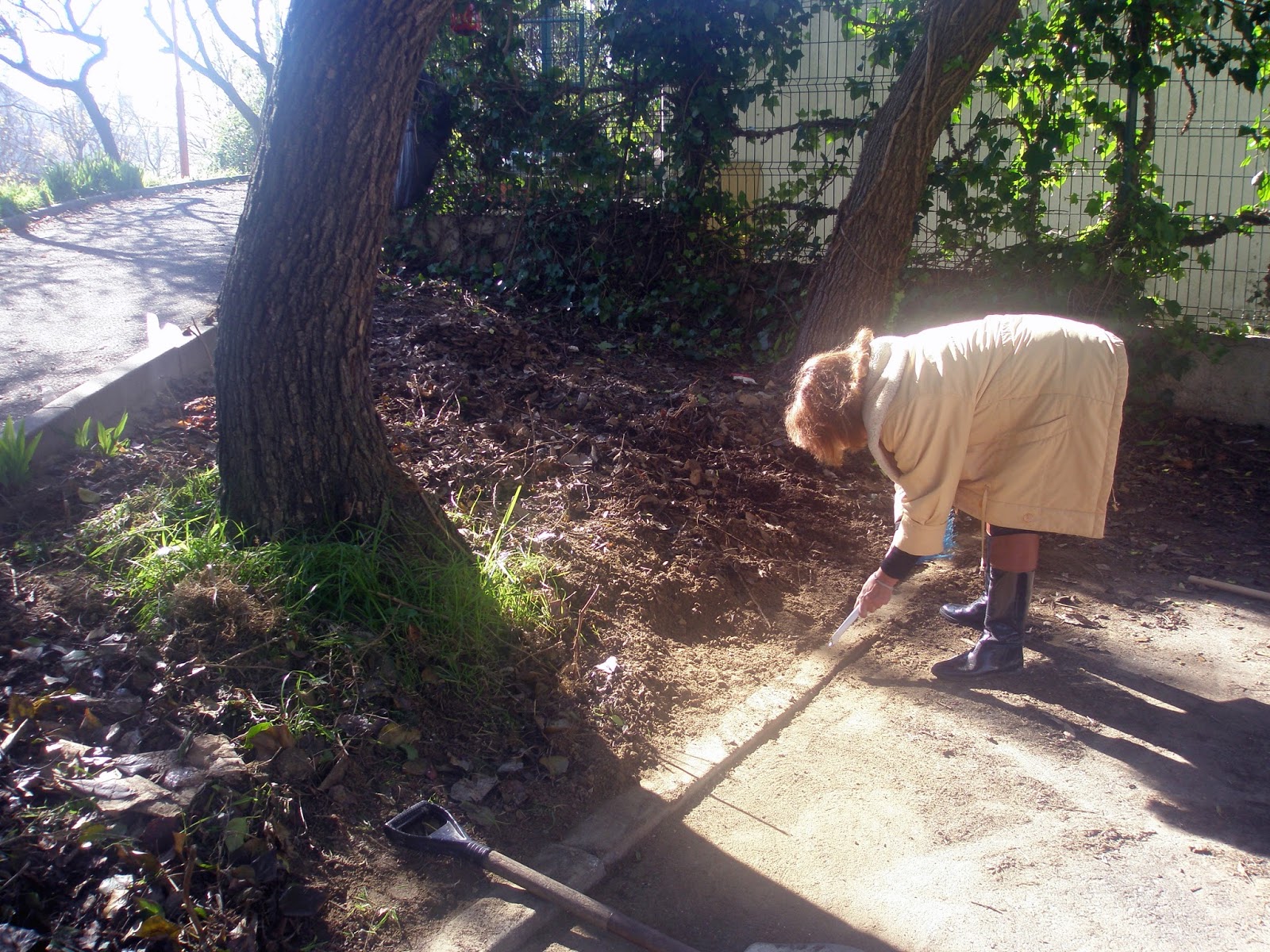 | A professora Celeste a recuperar um dos canteiros ao pé da Casinha da horta |